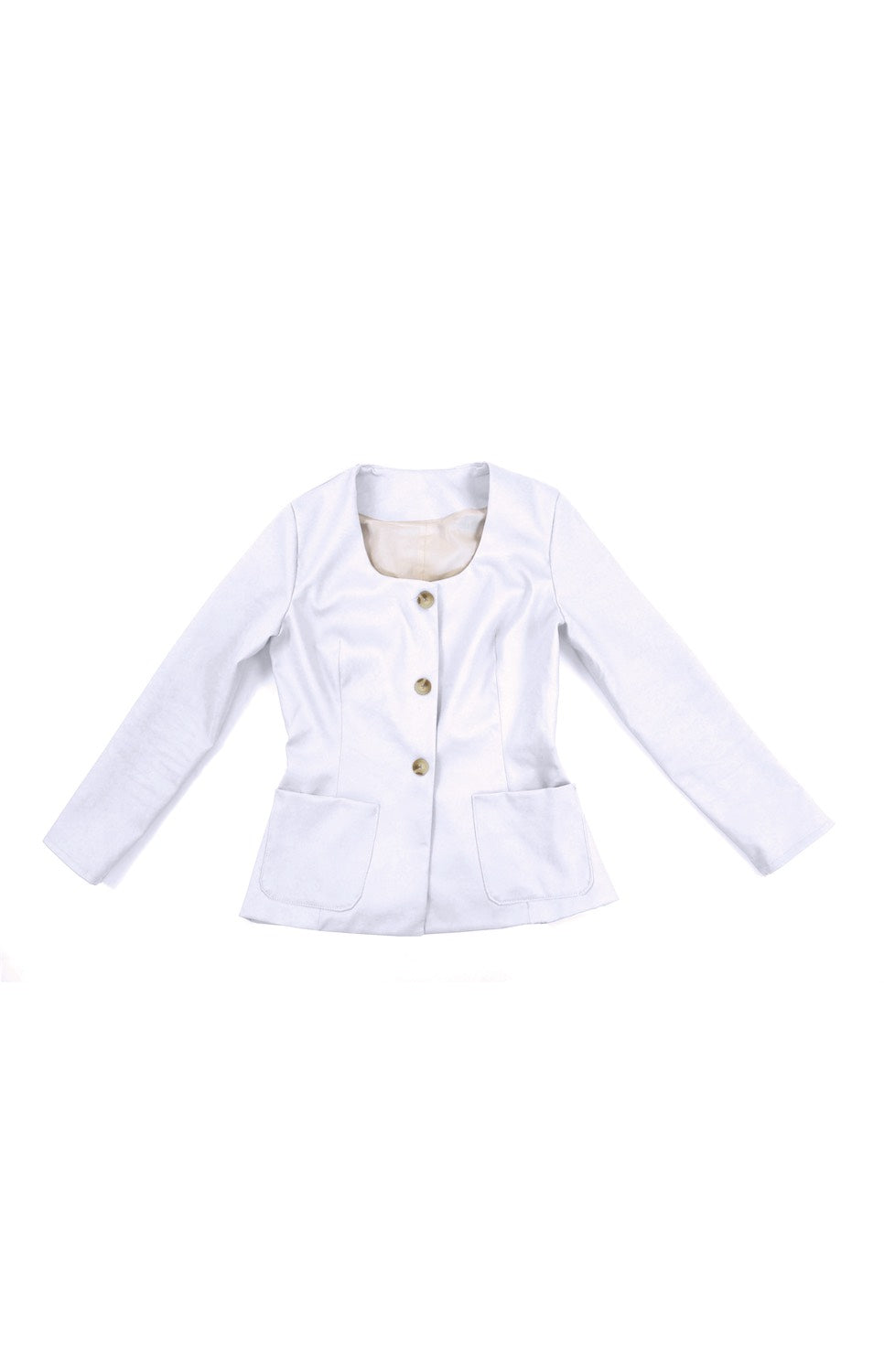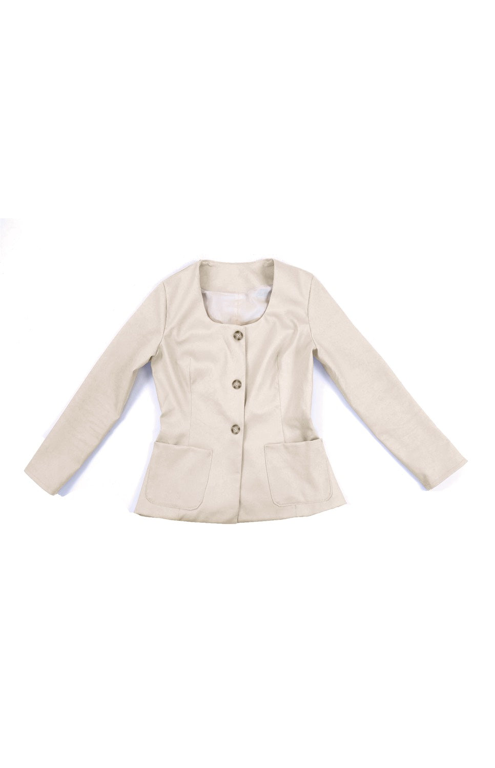 Top en coton satiné de style blazer, conçu pour offrir un look à la fois sophistiqué et confortable. La doublure en coton permet une meilleure respiration et une absorption optimale de l'humidité, garantissant fraîcheur et confort tout au long de la journée. Le col en forme de "scooped" et la fermeture à trois boutons assortis apportent une touche élégante et raffinée. Les manches longues et les poches arrondies appliquées ajoutent des détails fonctionnels et stylés, faisant de ce top un choix polyvalent et moderne pour toutes les occasions.
